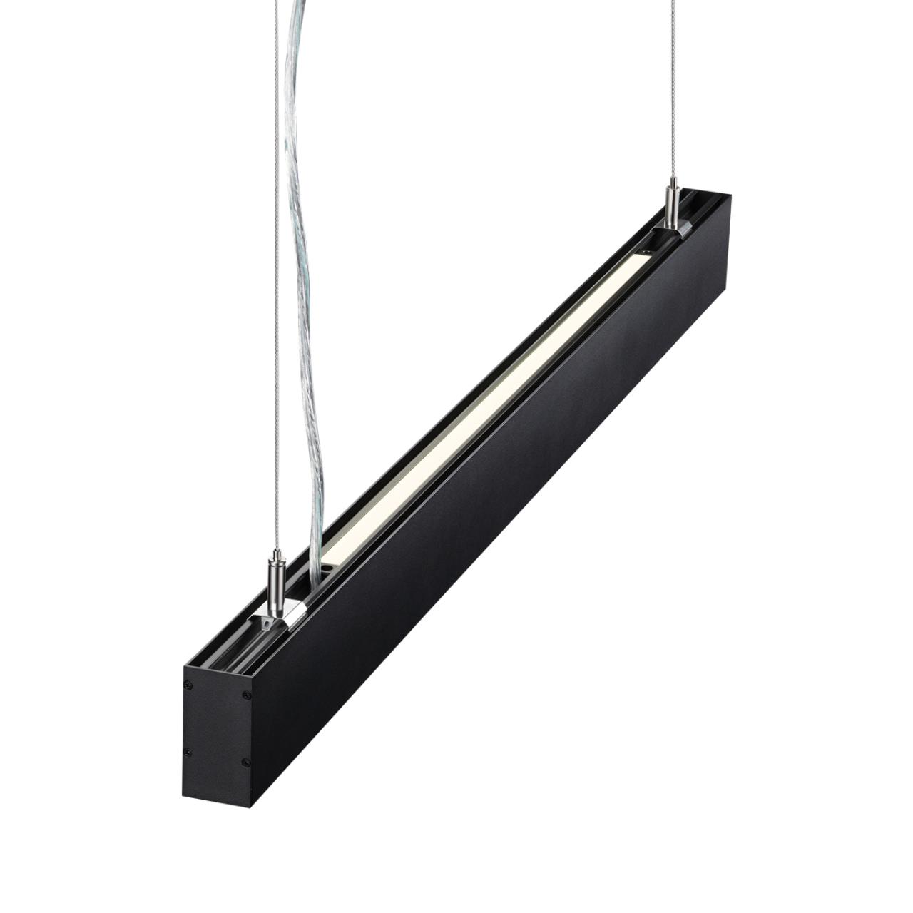 Линейные подвесные светодиодные светильники ITER. Удобное решение – купил и установил. Модельный ряд представлен: в двух размерах (Д)903 мм и (Д)1203мм, в двух классических цветах чёрном и белом. Способ установки только подвесной (подвесы в комплекте), потому что светильник светит вверх (12Вт) и вниз (30Вт). Драйвер электропитания размещается внутри светильника.