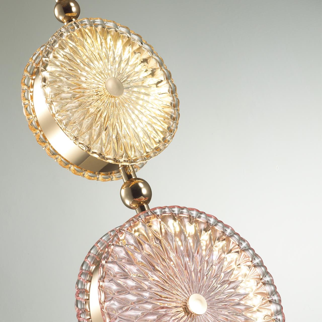 Линия светильников Caramella получила свое название благодаря сходству с карамельными конфетами. В ней сочетаются стекло нежных пастельных оттенков, металл золотого цвета, разнообразные паттерны стекол и современный LED-источник света. Светильники Caramella прекрасно впишутся как в современные, так и в классические интерьеры благодаря своему изящному дизайну. Из подвесных и настенных светильников линии можно создавать разнообразные композиции, внося в интерьер уникальные акценты.
