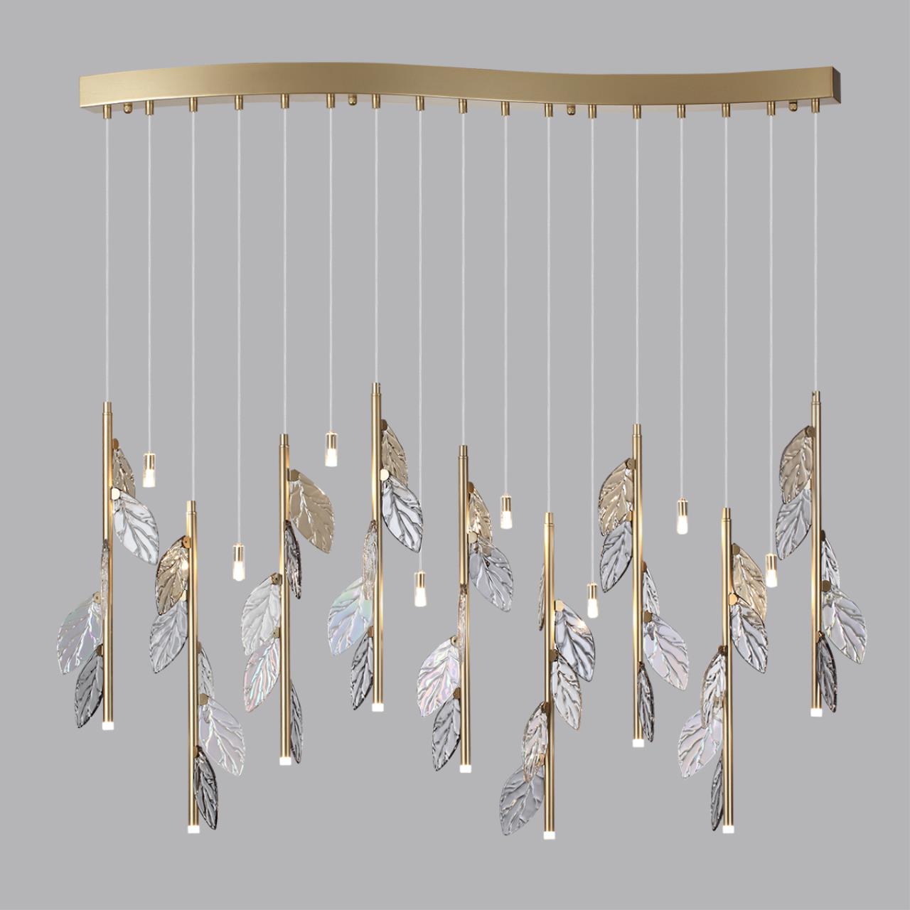Красота кружащихся в воздухе осенних листьев застыла в дизайне линии светильников Listva. Изящный потолочный светильник станет идеальным украшением обеденной зоны. Декоративные листья выполнены вручную в точности по эскизам дизайнера и имеют четыре оттенка: коньячный, дымчатый, прозрачный и с эффектом бензинового градиента. Потолочную композицию можно регулировать по высоте благодаря тросам и создавать уникальную форму светильника. Одиночный подвесной светильник поставляется с двумя вариантами потолочного крепежа в комплекте: встраиваемым и накладным.