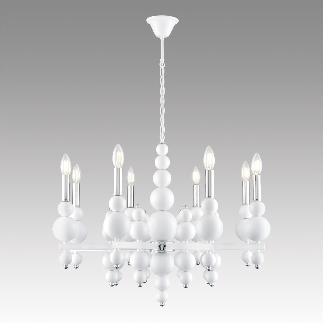 Светильники линии NANA имеют уникальный запоминающийся дизайн. Арматура светильников состоит из декоративных белых сферических элементов разного диаметра. А хромированные элементы в модели добавляют ей изысканности и очарования. В коллекции NANA имеются люстры на 6 и 8 ламп, а также бра на 1 лампу.