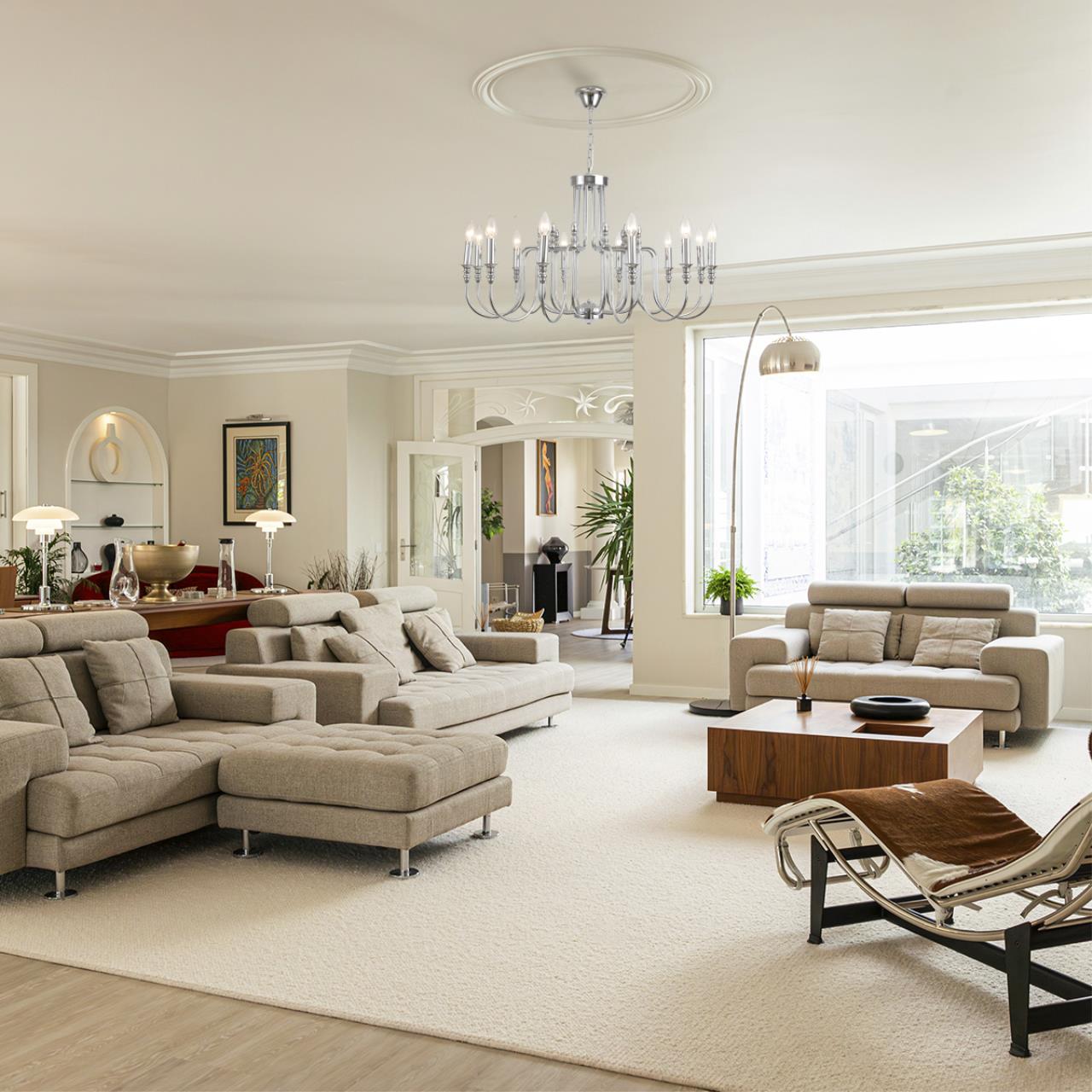 Простая на первый взгляд линия SUANA является ярким представителем стиля ар деко. Множество повторяющихся изогнутых линий, блеск металла и внушительные размеры делают эту линию привлекательной яркой и заметной в интерьере. При этом тонкая арматура и изящные подсвечники добавляют всей конструкции легкости и элегантности.